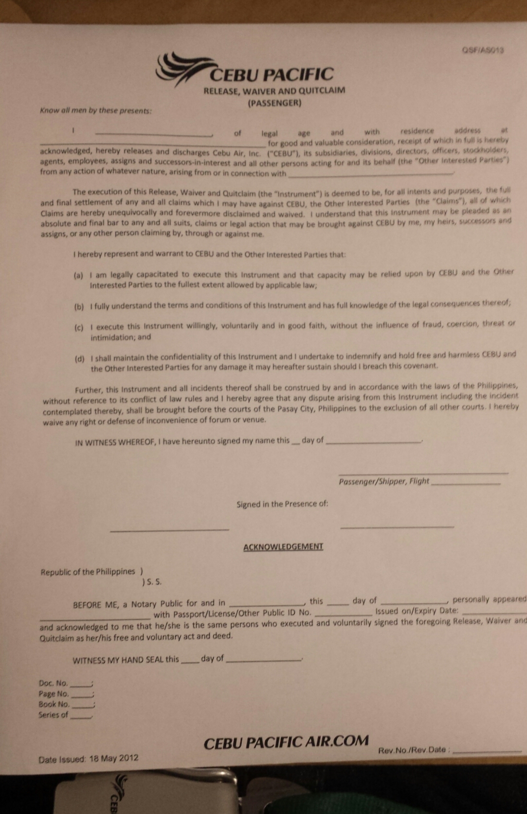 1. No worries. More people should know about this. Last December, they had a lot of delayed and cancelled flights and they were made to pay their passengers thousands of pesos, and that is probably the reason why they make their passengers unknowingly sign this quitclaim. It is just appalling that they are misrepresenting it as an acknowledgment receipt.