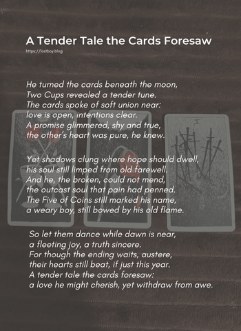 He carried the weight of a love once lost,a heart still tender, counting the cost.The past returned, not for love’s embrace,but for a friend and a familiar face. The Magician called with a clever hand,yet left him empty, adrift on the sand.The Hermit whispered: “Keep your space,your light is found in a quieter place.” Yet... Continue Reading →