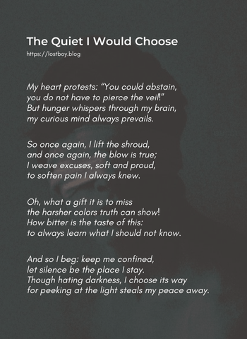 A blindfold rests upon my eyes,its fabric soft, its silence kind;I beg to live in gentle lies,for peace is sweeter when I’m blind. Yet still my restless fingers twitch,they lift the veil, they make me see;and every truth reveals its stitch,unraveling my kept serenity. The knowledge cuts, though not always—sometimes it only leaves a bruise;but... Continue Reading →