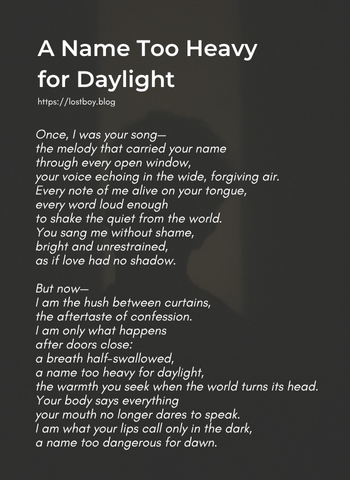 I walk the edge of comfort and despair,grateful for your voice that still finds mine,a fragile thread that says you still care—yet never enough to cross the line. Your laughter warms me, a fleeting sun,but I wonder what I am beneath your gaze.A secret kept, a door half-shut, undone,a ghost you visit in your quiet... Continue Reading →