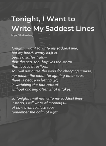 tonight, i want to write my saddest lines,but i will quell the tides of this stormthat stirs the peace and quiet of my heart.this typhoon now has a name—a name i have seen many moons ago,but i purposely kept my blindfold on,not to be blinded, but to keepthe tears from falling like rain. tonight, i... Continue Reading →