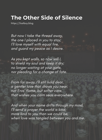 He walks the quiet corridors of thought,a boy still haunted by a ghost of fire.The rooms are empty, yet filled with planshe once had laid like bricks of desire—a life with him, a home of laughter,a map of tomorrows traced by their hands. He lingers in doorways no one opens,listens for footsteps that will not... Continue Reading →