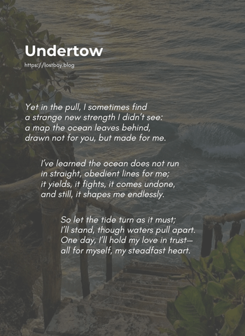It comes and goes, this leaving you:like tides that kiss then pull away,a rhythm old, yet always new,that shapes the shore but cannot stay. Some days, the sea lies soft and clear,its breath a lull, its gaze at rest;I almost think you’ve disappearedfrom all the harbors in my chest. But moons still rise, and with... Continue Reading →
