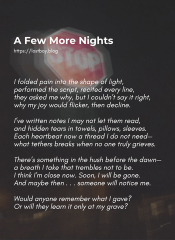 I walk through rooms that do not know my name,where silence echoes louder than my breath.Each step, a ghost’s; half-here, half-lost in shame,unseen beneath the weight of nearing death.I’ve smiled in ways that mimic those who heal,while bleeding out behind my quiet eyes.No scream escapes; they’d only call it “real”if blood could form its truth... Continue Reading →