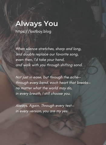 I walk the edge of comfort and despair,grateful for your voice that still finds mine,a fragile thread that says you still care—yet never enough to cross the line. Your laughter warms me, a fleeting sun,but I wonder what I am beneath your gaze.A secret kept, a door half-shut, undone,a ghost you visit in your quiet... Continue Reading →