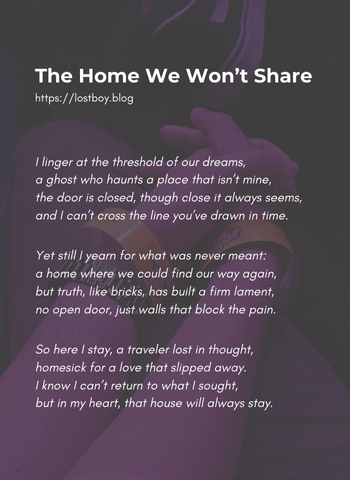 So here I stay, a traveler lost in thought, homesick for a love that slipped away. I know I can’t return to what I sought, but in my heart, that house will always stay.