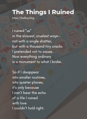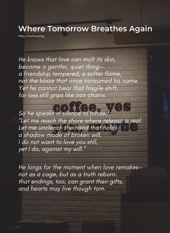 He walks the quiet corridors of thought,a boy still haunted by a ghost of fire.The rooms are empty, yet filled with planshe once had laid like bricks of desire—a life with him, a home of laughter,a map of tomorrows traced by their hands. He lingers in doorways no one opens,listens for footsteps that will not... Continue Reading →