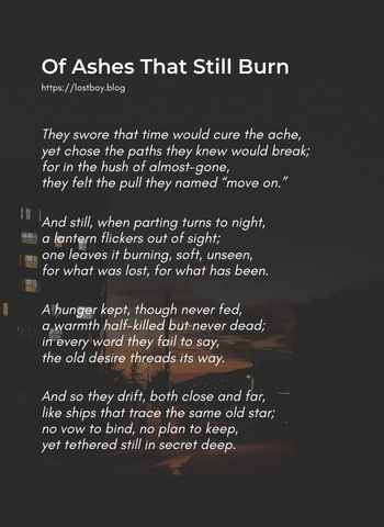 They said the bridge was burned to ash,yet lingered where the embers flashed;each found excuses, small and thin,to step once more where they had been. A glance became a borrowed flame,a brush of hands, a half-lost name;they dressed it up as passing chance,but left the room with weighted stance. The air between them bent and... Continue Reading →