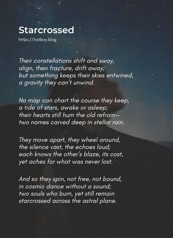 They drift in the dark like twin-born stars,bound by a thread no distance mars;an orbit drawn in ancient fire,between the pull and the desire. One blazes bright, a restless sun,whose flares can scorch but also stun;the other, cool as silver light,a moon that waxes into night. Each turn they make, the space will bend—a comet’s... Continue Reading →